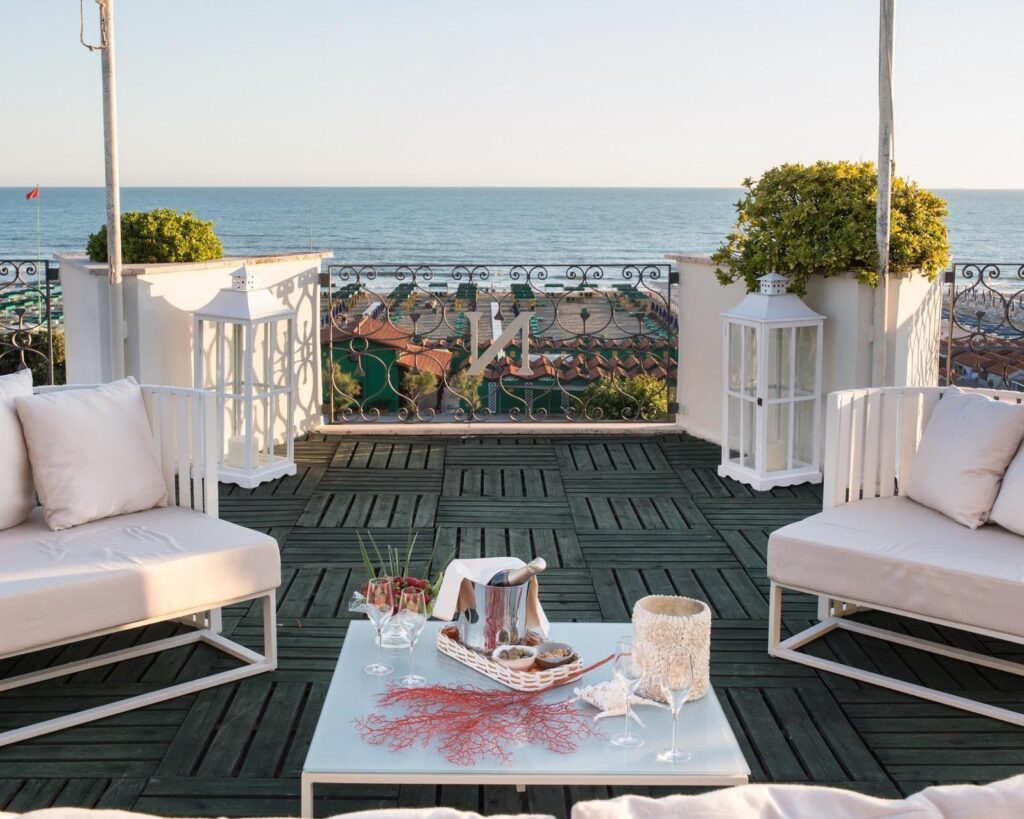 09.10.–16.10. — 7 Übernachtungen, Dbl standard, MIT FRÜHSTÜCK Direkt an der berühmten Strandpromenade von Forte dei Marmi gelegen, ist dieses Hotel perfekt für einen Urlaub auf hohem Niveau! Ein weißes Gebäude mit beigen Markisen, ein gepflegter Garten und ein einladender beheizter Pool mit Jacuzzi. Das freundliche Personal an der Rezeption, in der hellen Halle des Hotels, verwöhnt Sie mit erstklassigem Service. Die Bar, die Lounges sowie das Restaurant sind im typischen «Versilia»-Stil eingerichtet: weißer Marmorboden, elegante Vorhänge aus edlen Stoffen, große Fenster, die das Licht hereinlassen. Die eleganten Zimmer sind mit einem Balkon und einem Bad mit Badewanne ausgestattet. Die bezaubernden Zimmer auf der Vorderseite bieten den atemberaubendsten Meerblick der Gegend. Das Vergnügen, das Panorama von der Dachterrasse aus zu bewundern, ist definitiv umwerfend. Ein weiterer Vorteil dieses Hotels ist sicherlich seine zentrale Lage, in der Nähe des Zentrums von Forte dei Marmi und des exklusiven Forte dei Marmi Golf Clubs.