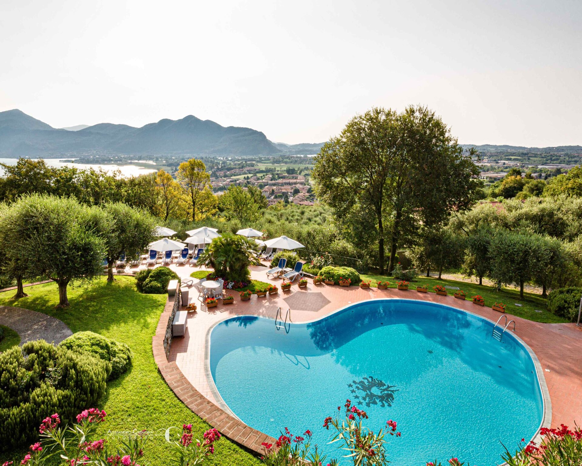 Das Hotel liegt inmitten einer 70 Hektar großen Grünfläche und blickt von einem sanften Hügel mit Olivenhainen auf den Iseosee. Von der Terrasse aus reicht der Blick bis zum Monte Isola, und der Blick verliert sich in der Schönheit dieses Seeabschnitts, den der berühmte Künstler Christo für sein berühmtes und letztes temporäres Werk „The Floating Piers“ ausgewählt hat.