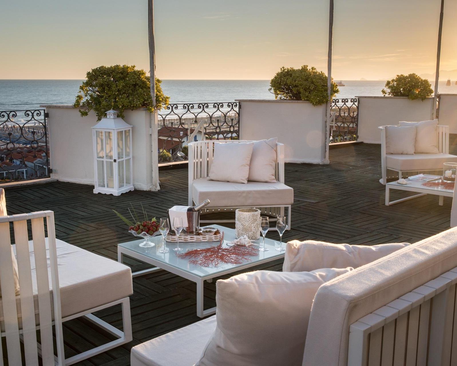 Justo enfrente del famoso paseo marítimo de Forte dei Marmi, este hotel es perfecto para unas vacaciones de alto nivel. Un edificio blanco con toldos de color beige, un jardín bien cuidado y una tentadora piscina climatizada con jacuzzi. El acogedor personal de la recepción, en el luminoso vestíbulo del hotel, le mimará con su servicio de primera calidad. El bar, los salones y el restaurante están decorados en el típico estilo «Versilia»: suelo de mármol blanco, elegantes cortinas de telas preciosas y grandes ventanales que dejan pasar la luz. Las habitaciones están equipadas con un balcón y baños con bañera. Las encantadoras habitaciones delanteras gozan de las más impresionantes vistas al mar de la zona. El placer de admirar el panorama desde la terraza de la azotea es definitivamente alucinante. Otra ventaja de este hotel es sin duda su céntrica ubicación, cerca del centro de Forte dei Marmi y del exclusivo club de golf de Forte dei Marmi.