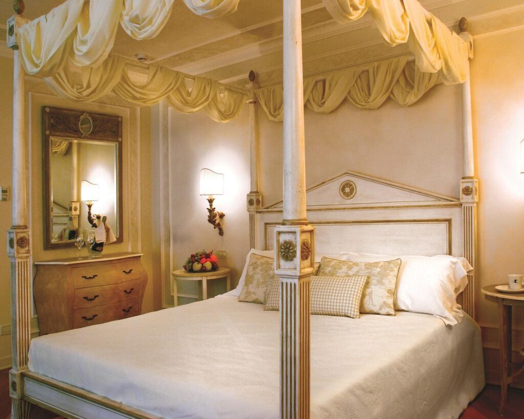 Der Drang, vor dieser charmanten alten Abtei niederzuknien, ist groß. Das Garda Hotel San Vigilio Golf, das aus einem 27-Loch-Meisterschaftsgolfplatz, einem Apartmenthaus und einem Vier-Sterne-Hotel besteht, bietet viele schöne Winkel. Die beiden Gebäude der alten Abtei, in denen sich die Zimmer befinden, wirken von außen wie im Landhausstil, aber ihre Innenräume überraschen durch ihre Eleganz und die perfekte Kombination verschiedener Materialien wie Marmor und Holz. Die großen, hellen Zimmer und Suiten wurden auf halbem Wege zwischen traditionellem und innovativem Stil gestaltet. Sie verfügen alle über einen cremeweißen Parkettboden, einen Flachbildfernseher und Marmorbäder. Bemerkenswert sind die Stuckdecken und die Einrichtung im neoklassizistischen Stil. Darüber hinaus werden Sie eine ganz besondere Note bemerken: Auf den Gemälden von Jouy werden Sie einige Golfer erkennen! Einige Zimmer sind mit einem Kamin ausgestattet, andere verfügen über Balkendecken und bieten eine großartige Aussicht entweder auf den Golfplatz oder auf den charmanten Innenhof. Mit anderen Worten: Dank dem gehobenen Garda Hotel San Vigilio Golf erstrahlt ein neuer Stern am Himmel des Gardasees.